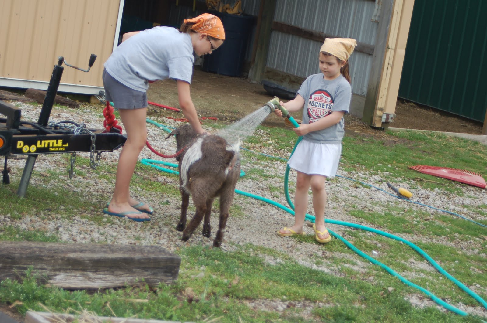 Emma got a bee in her bonnet and talked Lily into giving the goats a bath. The goats fought it every step of the way but it got done. Please note that we all decided we had to wear bandana's today. I'm not sure why. I can't even begin to imagine were the kids found theirs.